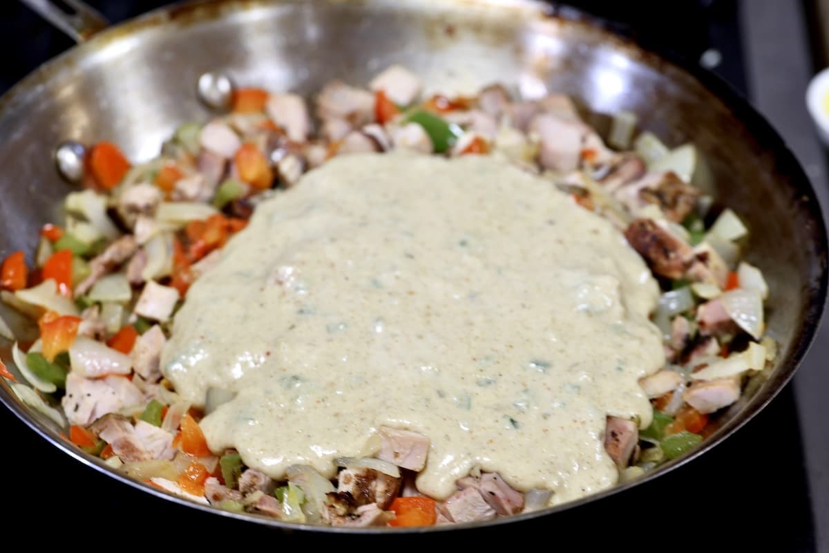 - Pour the warm queso over the chicken and pepper mixture. Stir until everything is evenly coated.